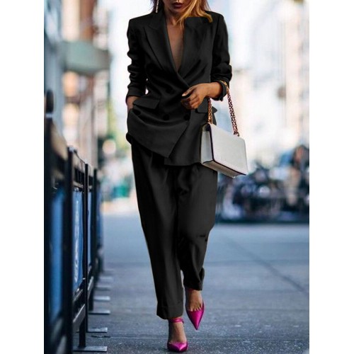 Solid Double Breasted Elastic Waist Lapel Two Piece Set
