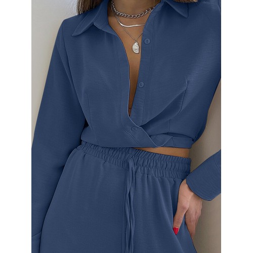 Solid Drawstring Elastic Waist Pocket Button Two Pieces Set