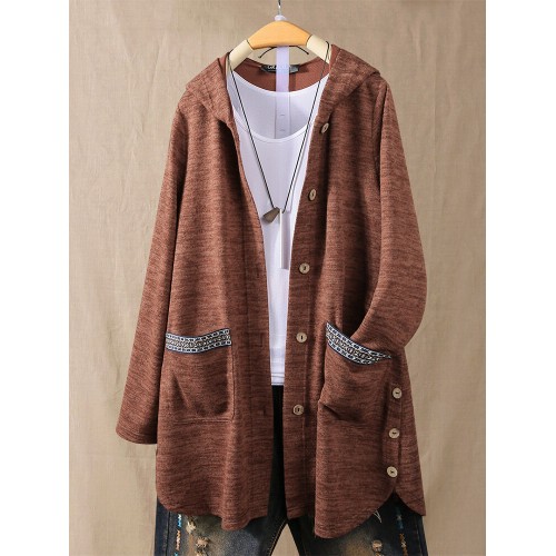 Vintage Print Fleece Hooded Plus Size Coats with Pockets