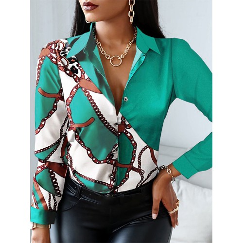 Chain Print Contrast Color Lapel Long Sleeve Button Shirt