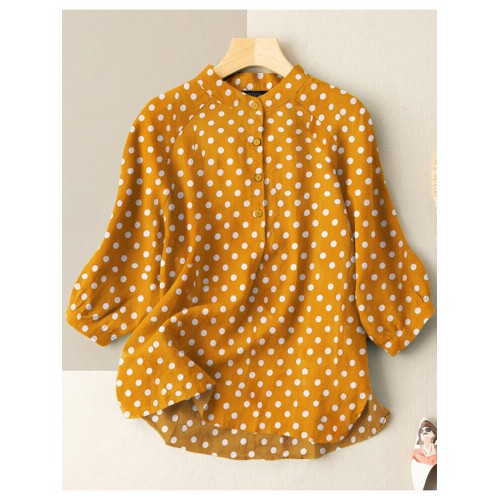 Description: Color:White,Yellow,Navy Closure Type:Button Decoration:Button Material:Polyester Neckline:Stand Collar Pattern Type:Polka Dot Scene:Leisure,Casual Season:Spring,Autumn Size:4XL,M,L,S,XL,5XL,2XL,3XL Sleeve:Three Quarter Length Sleeve Style:Casual,Work Thickness:Regular Package Included: 1*Blouse < |