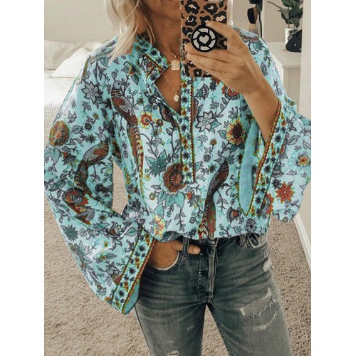 Ethnic Floral Print V Neck Long Sleeved Bohemian Shirts For Women