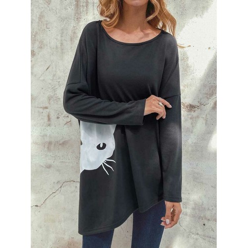 Irregular Cartoon Cat Print Long Sleeve Splited Blouse
