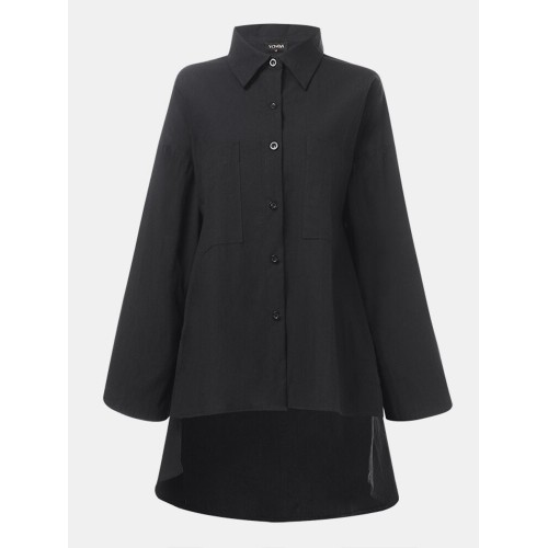 Long Sleeve Solid Color Lapel Pocket Irregular Hem Shirts For Women