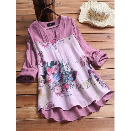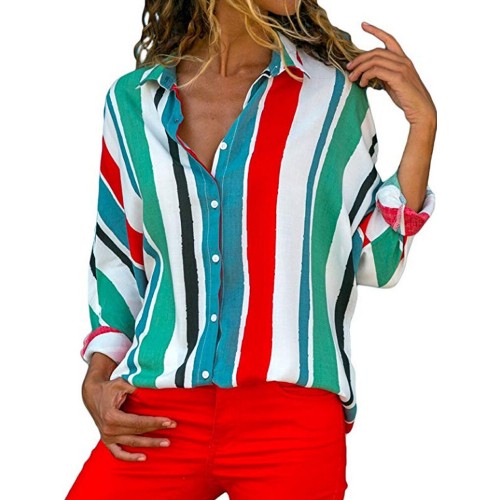 Women Casual Stripe Floral Print Buttons Turn-Down Collar Long Sleeve Blouse