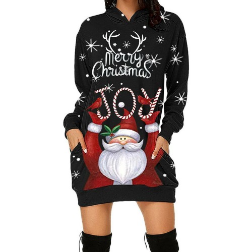 Women Christmas Santa Claus Pattern Side Pockets Long Sleeve Casual Hooded Sweatshirt