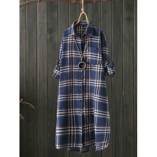 Women Long Sleeve Plaid Casual Asymmetrical Long Blouse