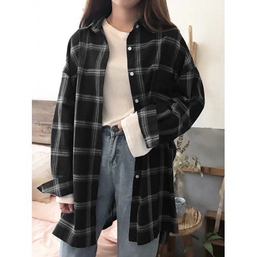 Women Long Sleeve Plaid Casual Asymmetrical Long Blouse