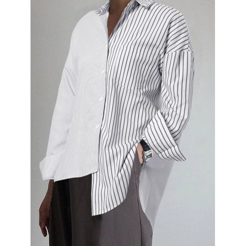 Women Striped Patchwork High Low Hem Lapel Long Sleeve Blouse With Pocket