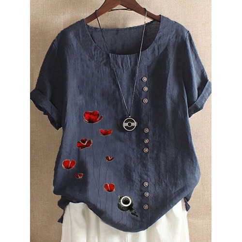 Women Vintage Red Flower Print Button Casual Loose T-shirts