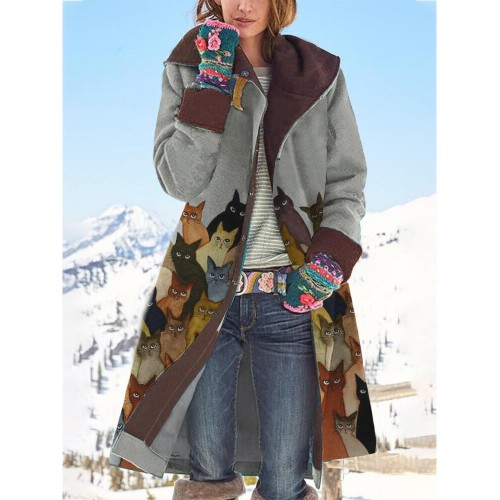 Women Cartoon Cat Print Long Sleeve Thick Warm Hooded Coats