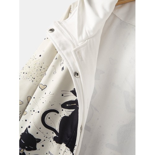 Women Cartoon Music Cat Print Zipper Front Long Sleeve Thick Hooded Coat