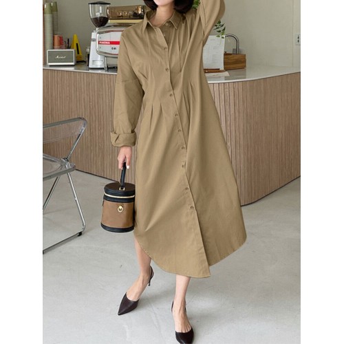 Women Shirt Collared Spliced Buttons Pleated Solid Casual Midi Dresses