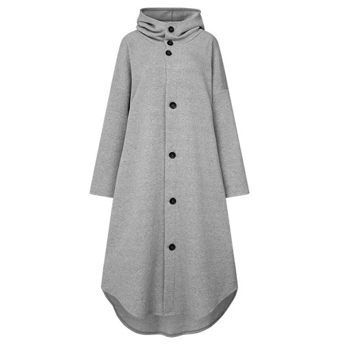 Women Solid Color Button Down Front Pocket Mid-Calf Length Hoodie Jacket