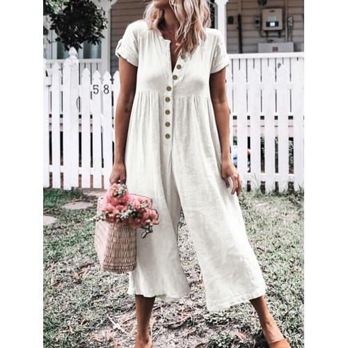 Women Short Sleeve Button Solid Color Wide Leg Pant Jumpsuit Overalls