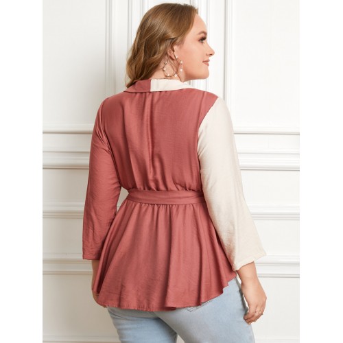 Plus Size V-neck Belt Design Patchwork Blouse