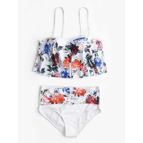 Plus Size Women Floral Print Spaghetti Straps High Waist Bandage Tankini