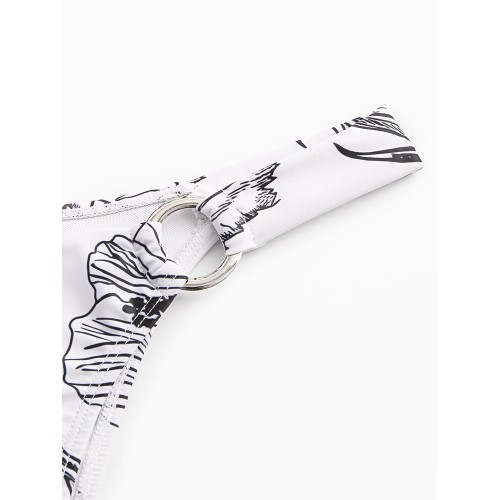 Women Simple Plant Print Hollow Ring Backless Swimsuit Thong Bikini For Swimming